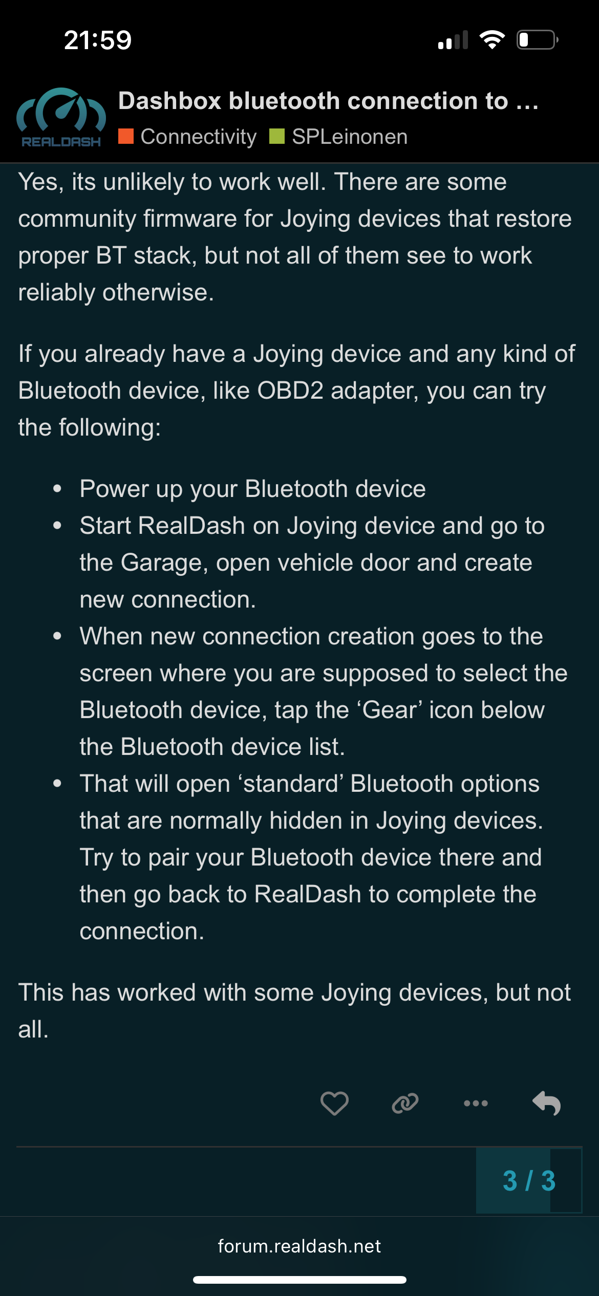 Hi everyone, I tried connecting Dashbox to a Prixtom Chinese Android tablet and it connected perfectly via Bluetooth, so I ruled out the possibility that the Dashbox’s Bluetooth was damaged. Then I tried configuring Bluetooth as you explained in this old forum thread and… it worked! The Chinese Android radio connected to Dashbox. The problem I’m encountering now is that Bluetooth doesn’t connect automatically after the power is cut off. On the Chinese Android tablet, it does connect automatically after turning it off and on, but the problem is that it doesn’t have an option to configure automatic app startup so that RealDash runs when the tablet is turned on. Each unit has its drawbacks, and my question now is: Which Android units are the best in terms of Bluetooth connection, automatic Bluetooth connection after turning it off and on, and automatic app startup configuration? Regards.