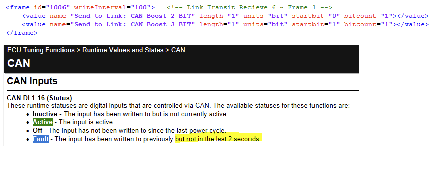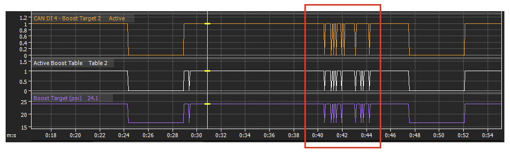 I did have to decrease the XML āwriteintervalā to 100 to prevent the ECU from toggling a āFaultā state on the CAN input, as it expects the value being sent from RealDash to be written at least every 2 seconds - while this has fixed the ECU CAN input going into āFaultā when activated from RealDash, it hasnāt resolved the sporadic on/off behavior as shown in the image above.