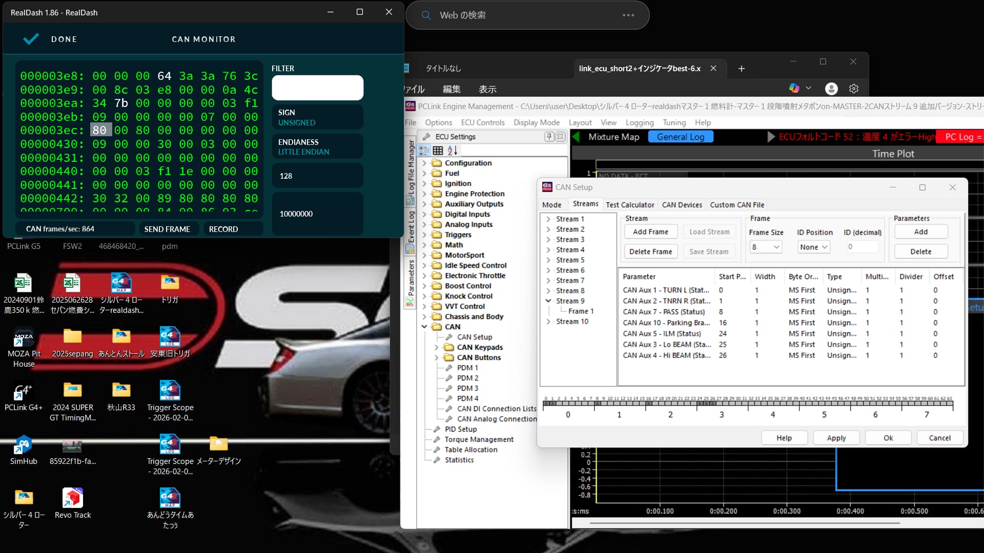 You configure User Stream 9 as base ID of 1004 decimal. That is 0x3EC in hex, so that should be the frame of interest in RealDash CAN Monitor. I don’t see frame 0x3EC in CAN Monitor screenshots, so its probable that it is not sent by the ECU.