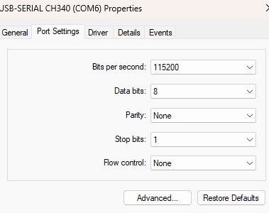 When I opened up the “Port Settings” tab noticed that the default Baud rate was set to 9600, tried to change to the dongle default 2000000 but the max it goes is 128000, so I did set up 115200 on the device manager as shown in the next image.