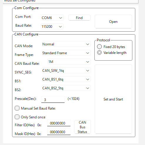 Set up Waveshare USB to CAN using Waveshare USBCAN V2.12 configurator with a Baud Rate initially with the default value: 2000000